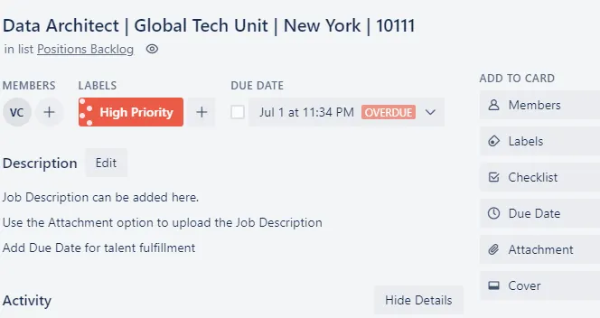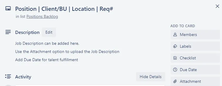 You can create cards; each card describes a requisition to be fulfilled. title must be provided to the card. You can name the requisition card in the given format “Position | Client/Business Unit | Location | Requisition No.” like “Data Architect | Global Tech Unit | New York | 10111”.