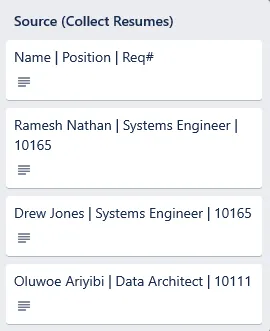 When resumes are collected in response to the open requisitions, represent each one with its own Trello card.