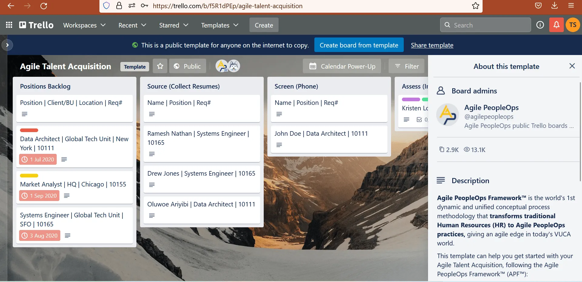 The Agile Talent Acquisition Scrum for Trello Board (published on June 24, 2020, on Trello) outlines the recruitment workflow that recruiters, recruitment or talent acquisition specialists, and HR professionals can use in their respective organizations.