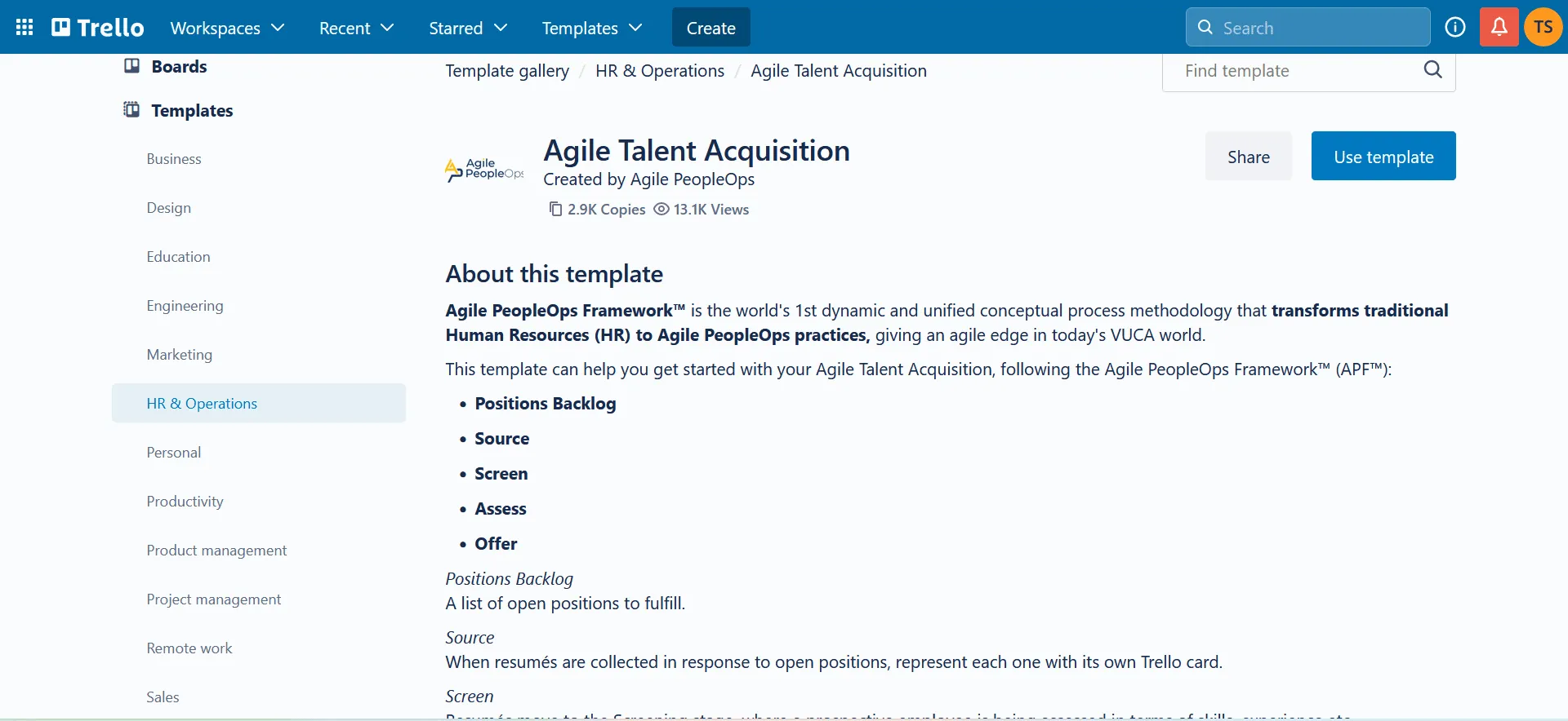 After signing in, you can click on Use Template and create an Agile Talent Acquisition board.